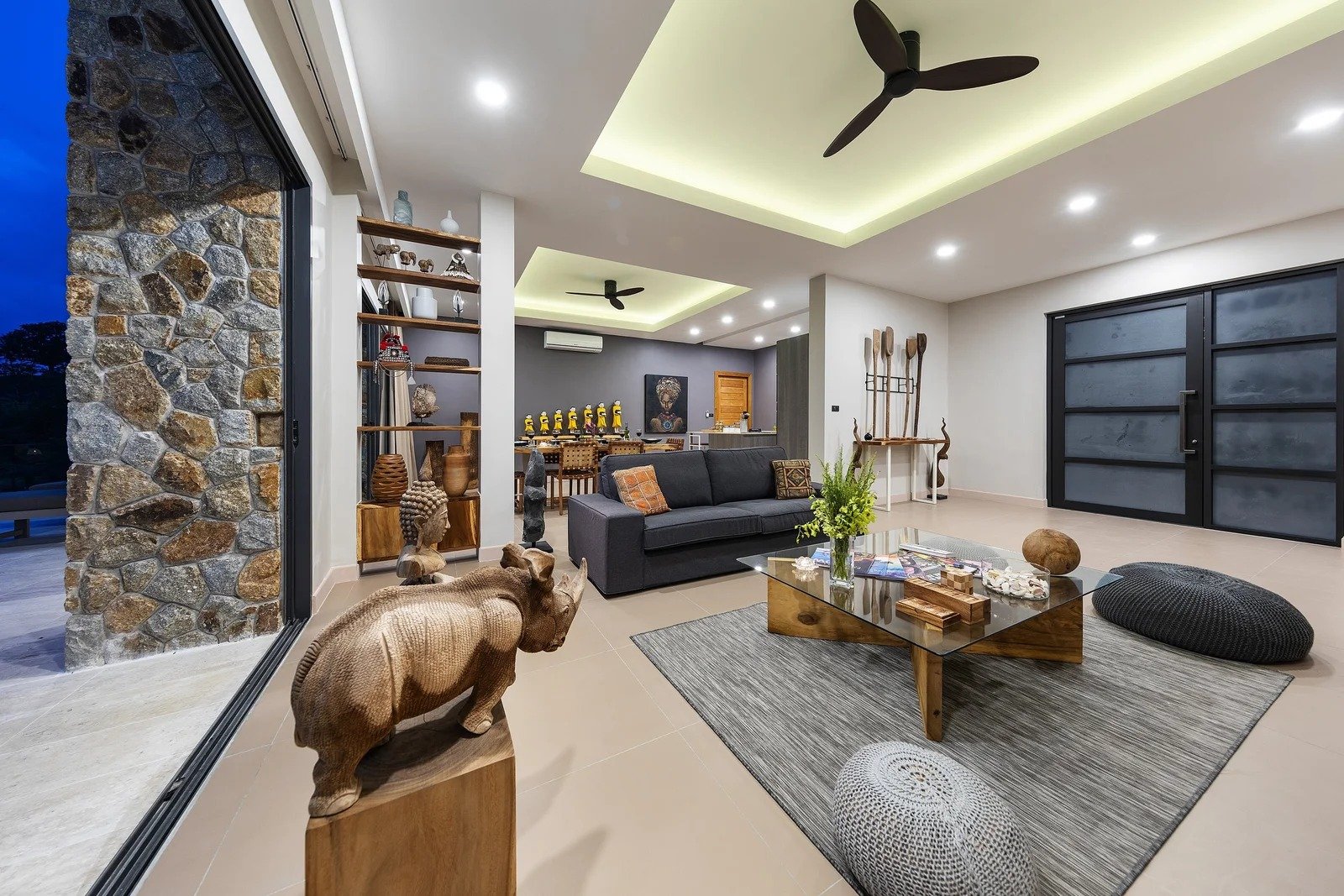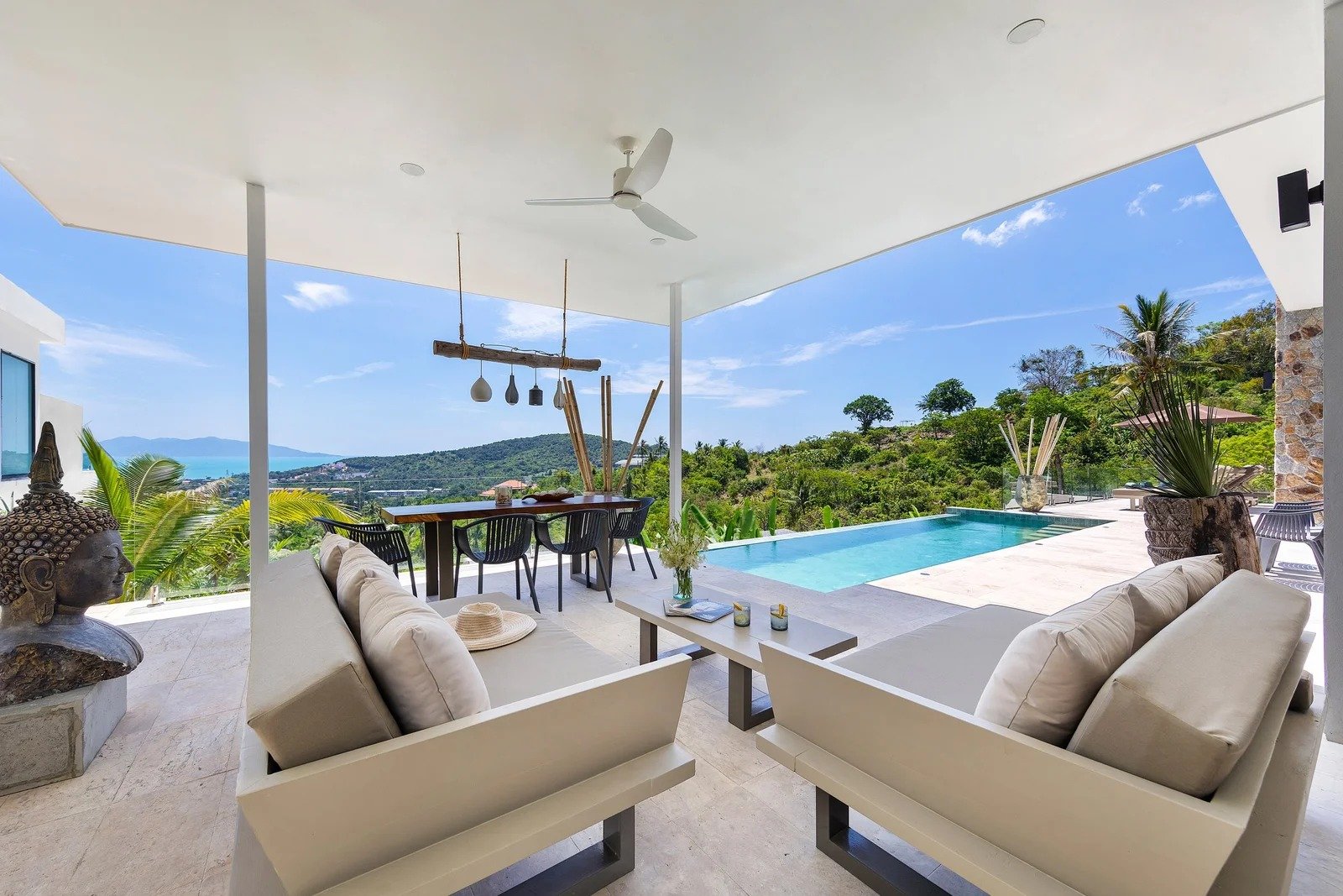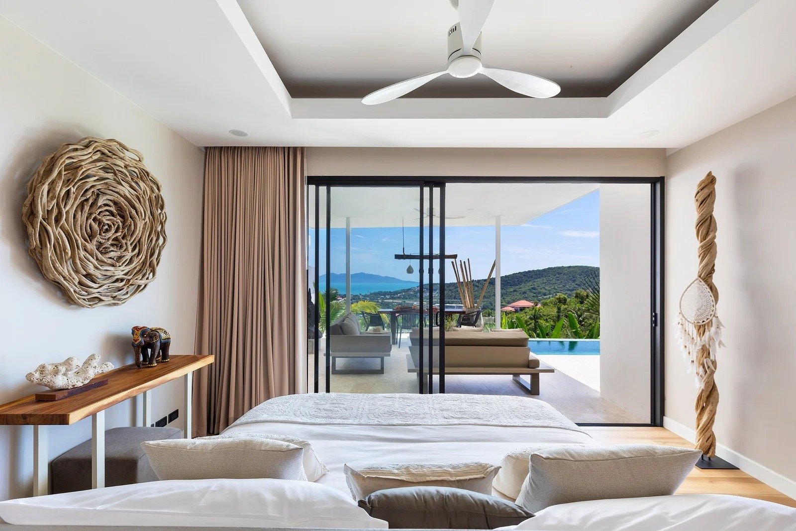 La villa se distingue par son ambiance sereine, ses lignes équilibrées et une identité marquée. Le mobilier sur mesure, les matériaux naturels et les teintes douces composent un ensemble harmonieux et chaleureux.